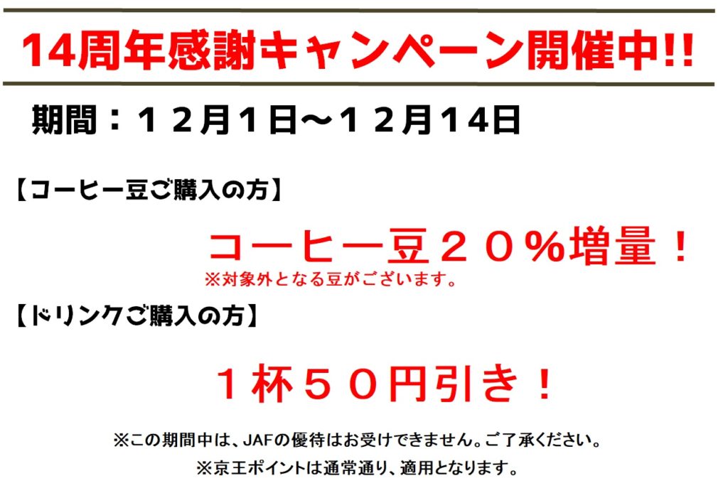 14日までは、コーヒー豆は20%増量、テイクアウトドリンクは50円引きとなります。