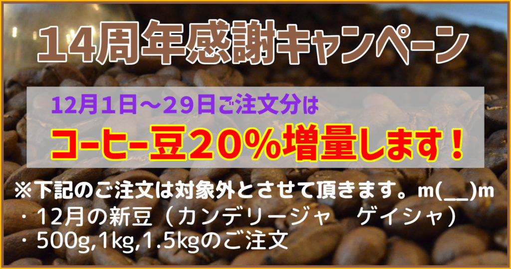 ネットショップでは、1日~29日の間にご注文いただいたコーヒー豆を20%増量してお届けします。